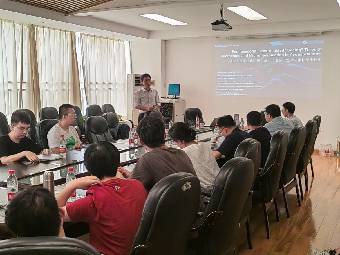 5日上午,苏教授为西北工业大学师生来带了《飞秒激光超声技术之新应用:“看穿”芯片及操控微小粒子》的学术讲座,介绍了香港理工大学在飞秒激光技术方面的突破性进展,为光声耦合提供了新的视角,开辟了令人兴奋的应用前景。苏教授详细讲解了基于超快激光超声的无损评估新框架,通过利用飞秒激光产生的超声波,实现了纳米尺度上的超高分辨率材料表征。通过对具有高度各向异性的单晶半导体晶片及不透明堆叠微系统的内部特征进行三维成像,该方法从基本理论到实现细节均得到了实验验证。此外,苏教授还分享了超快激光在皮秒声流学研究中的新应用范例,其中包括一种综合了光声镊和声镊优点的光声镊技术。通过瞬态热弹性耦合,脉冲超快激光通过液体照射衬底,触发环形传播光声波并产生声辐射力,用于操纵液体中的微小颗粒。这种以非接触方式进行的方法为超微结构的损伤监测开辟了新的思路和方向。