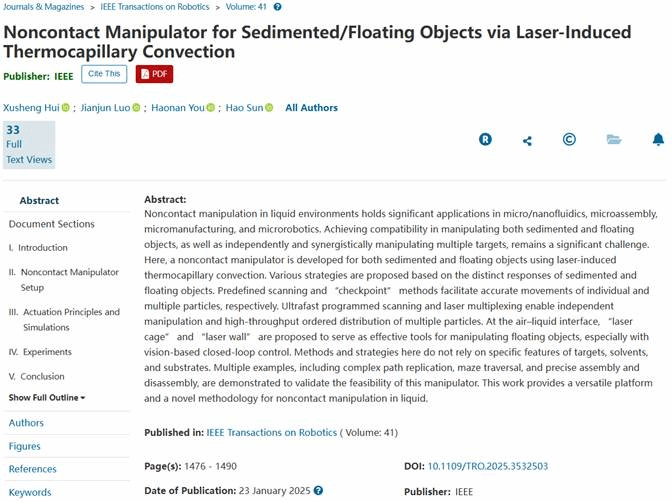 罗建军教授团队博士生惠旭晟在液体环境非接触式操控技术研究方面取得了突破性进展。相关研究成果以“Noncontact Manipulator for Sedimented/Floating Objects via Laserinduced Thermocapillary Convection”等为题形成了系列论文,发表在机器人领域顶级期刊《IEEE Transactions on Robotics》 (T-RO)、机器人顶会《IEEE International Conference on Robotics and Automation》 (ICRA 2025接收),以及机电领域顶刊《IEEE/ASME Transactions on Mechatronics》 (TMECH)上,西北工业大学为上述系列论文的唯一作者单位,博士生惠旭晟为上述系列论文的第一作者,美高梅博彩