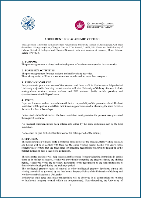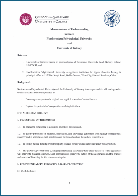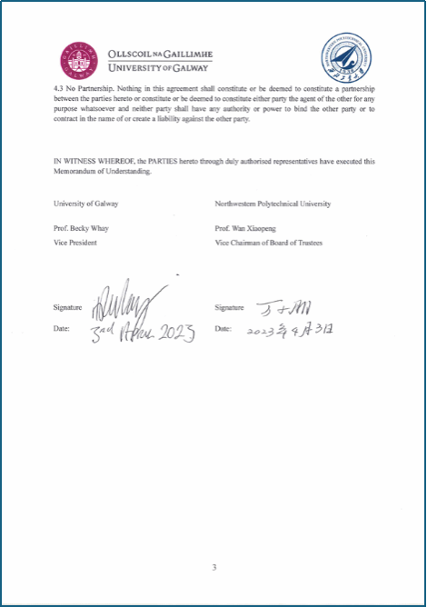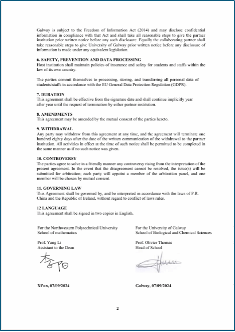 爱尔兰高威大学与西北工业大学有着良好的合作基础,双方于2023年签署战略合作协议,并开展高层领导互访,师生交流,暑期游学,合作科研等项目。以下为两校战略合作协议美高梅博彩与末页。