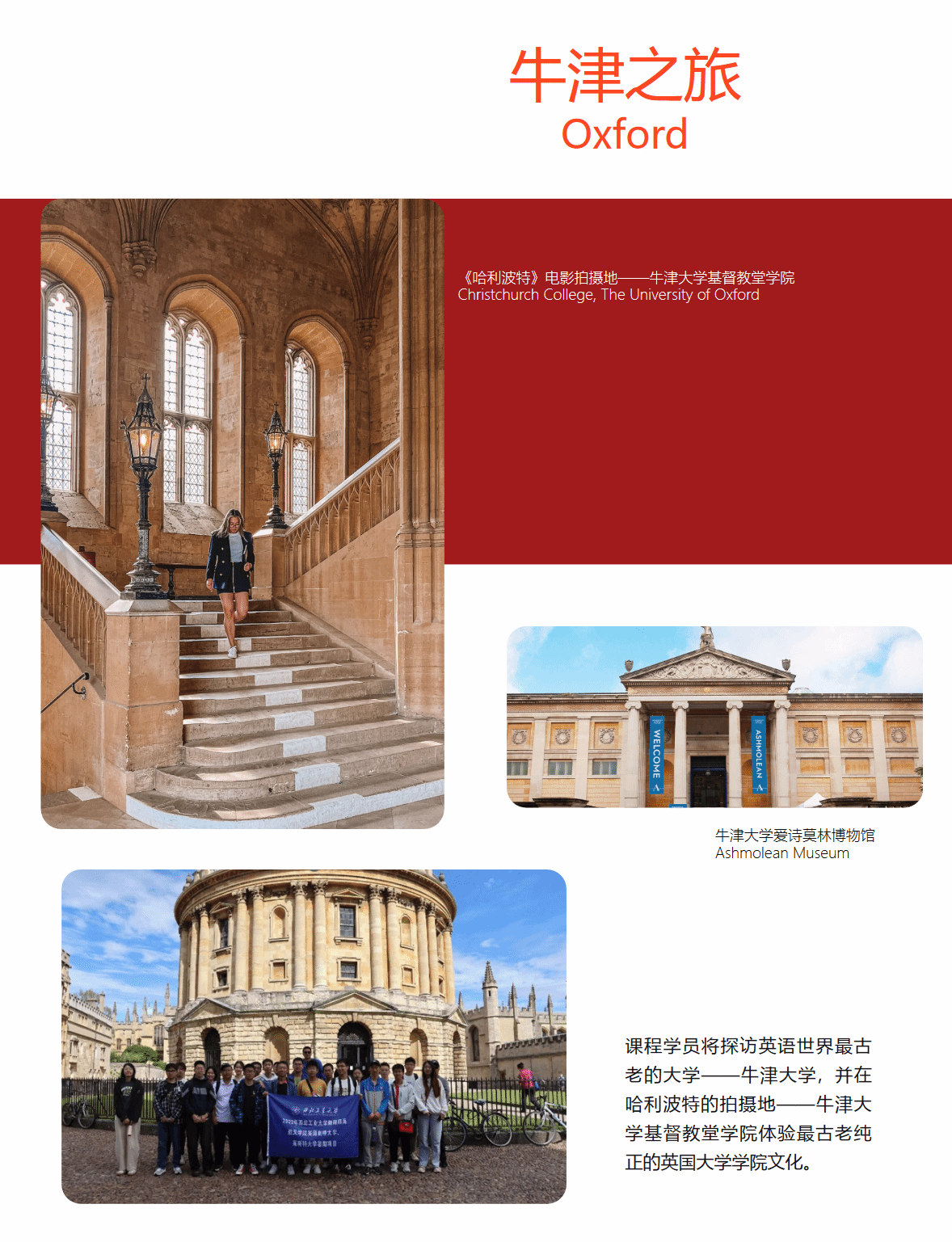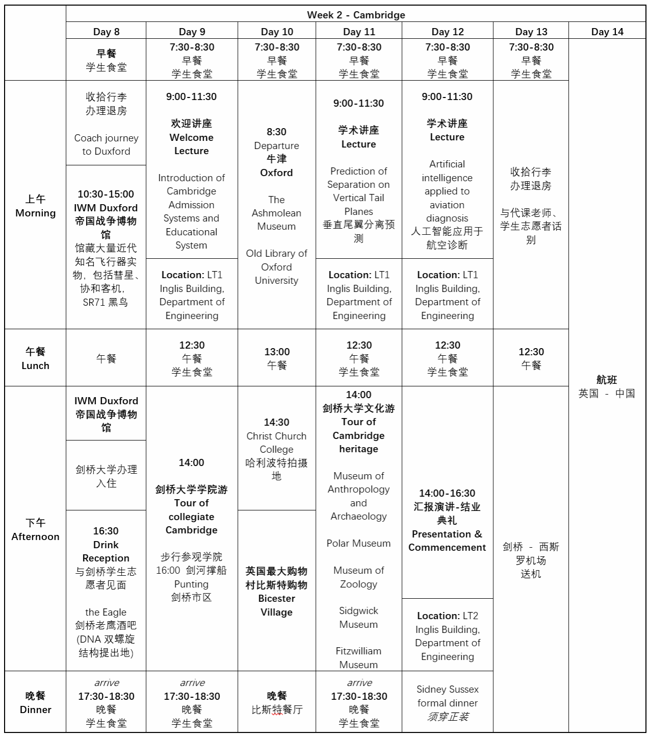 平台,在以剑桥大学、莱斯特大学各位教授和同学带领下,接触到国外相关领域的前沿科技,学习高校在同专业方向的研究内容,了解英国传统文化,体会各地自然风光。回头看来,项目不仅丰富了知识,开阔了眼界,同时培养了我待人处事的能力,以及更加开放包容的心态。”