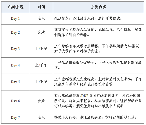 学校在航空航天、人工智能、机械工程、材料、电子信息等工科方向优势突出。本项目将依托首尔大学课程和韩国头部科技企业参访资源,构建“课堂学习—高校交流—城市实践—企业参访—成果汇报”的完整研学链条。